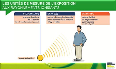 Le becquerel (Bq) mesure l’activité de la source. Le gray (Gy) mesure la dose absorbée. Le sievert (Sv) quant à lui estime l’effet du rayonnement sur l’homme.